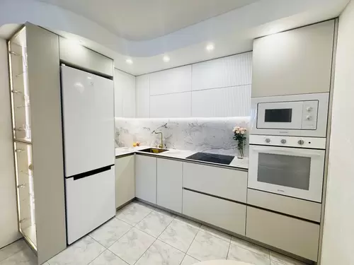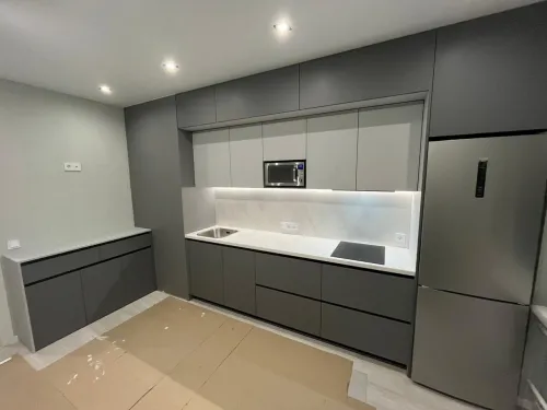 Помимо проектировщика, который рисует проект на контрольный замер выезжает специалист с профессиональным оборудованием и обмеряет помещения. После этого технолог вписывает проект в ваше помещение, разарабатывая карты кроя для производства. Так мы добиваемся идеального монтажа кухни за 1 день без ошибок.